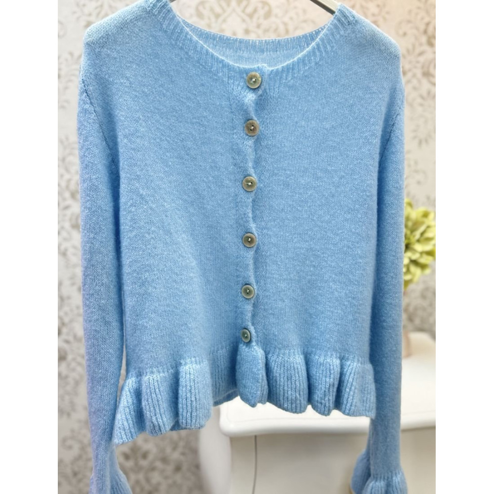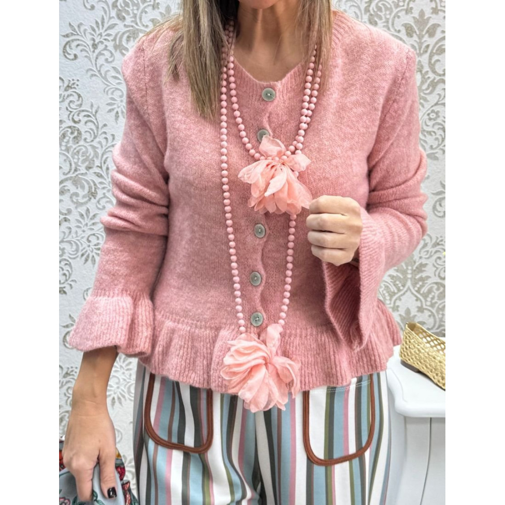 Rebeca de punto con acabado suave presenta un diseño de corte recto y manga larga. Dispone de un cuello redondo con remate de canalé y un cierre frontal de botones El elemento distintivo es el acabado en volante de canalé que recorre tanto el bajo de la prenda como los puños.