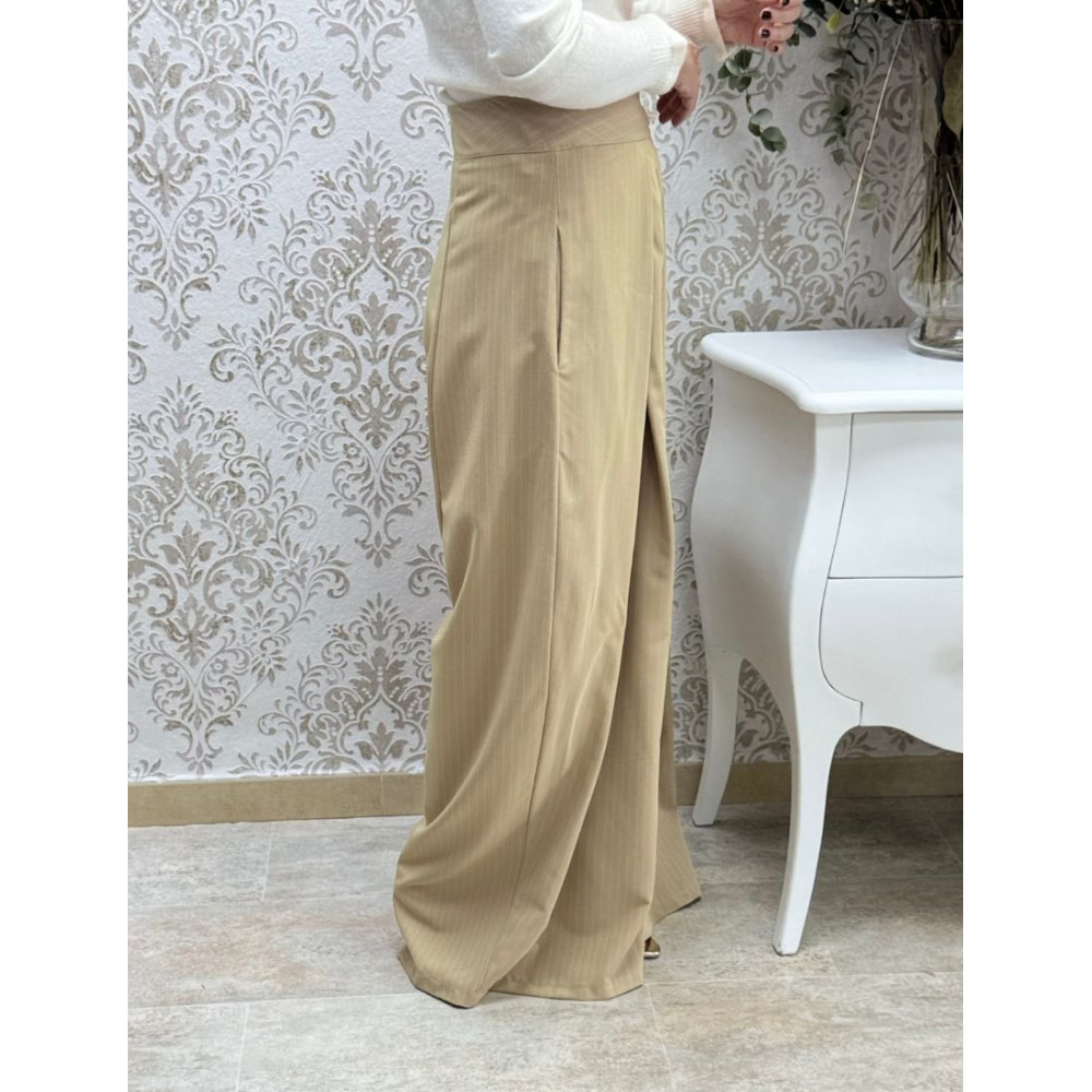Pantalón de pernera ancha y silueta fluida confeccionado en tejido con estampado de raya diplomática en tono beige. La prenda presenta un diseño de tiro alto con cintura ancha y un sistema de cierre frontal asimétrico mediante una tapeta. Destaca por la incorporación de dos tablas profundas en el delantero que nacen de la cintura para aportar volumen y estructura a la caída, manteniendo un patrón de corte recto y holgado hasta el bajo.