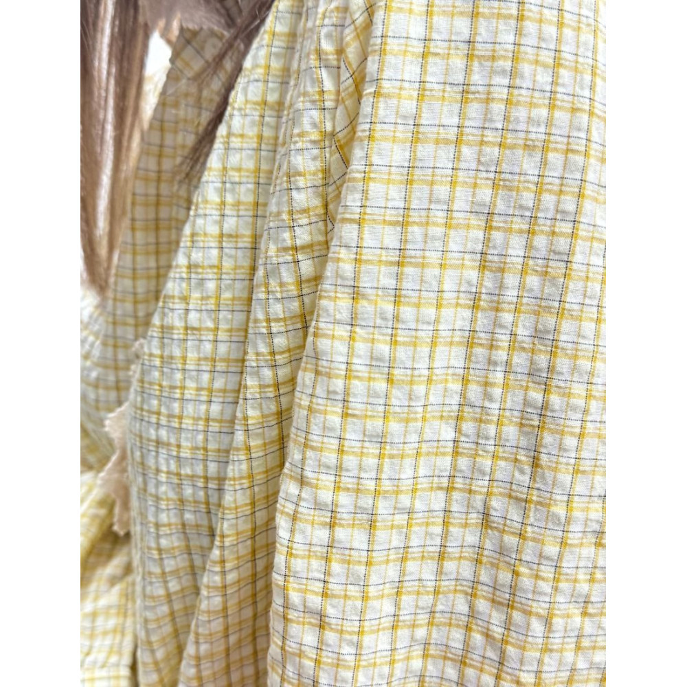 Camisa de cuello mao y estampado de microcuadros en color amarillo y blanco. Presenta una botonadura frontal central decorada con una tira de encaje de blonda en tono crema que se extiende desde el cuello hasta el bajo de la tapeta. El diseño incluye mangas largas con hombro ligeramente fruncido y puños camiseros estrechos con cierre de botón individual.