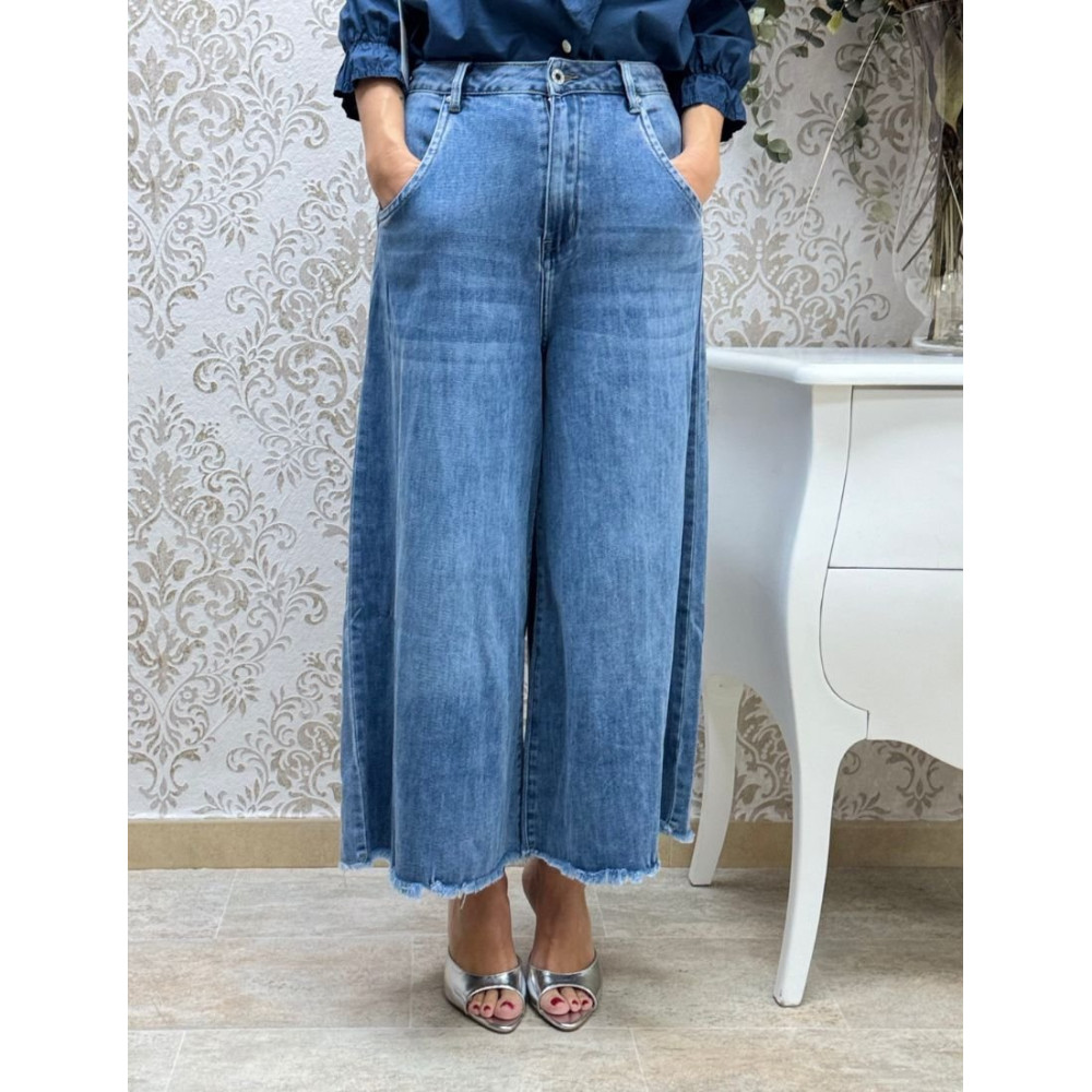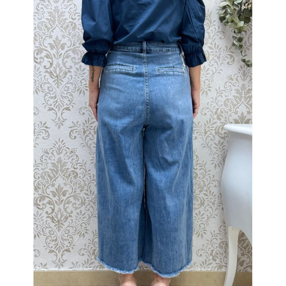 Pantalón vaquero de corte culotte y silueta de pierna ancha confeccionado en tejido denim con lavado medio. Presenta un diseño de tiro alto con pretina de trabillas, cierre frontal de botón metálico y cremallera, complementado con bolsillos laterales de entrada curva. El bajo cuenta con un acabado de terminación desflecada y una longitud que llega por encima del tobillo.