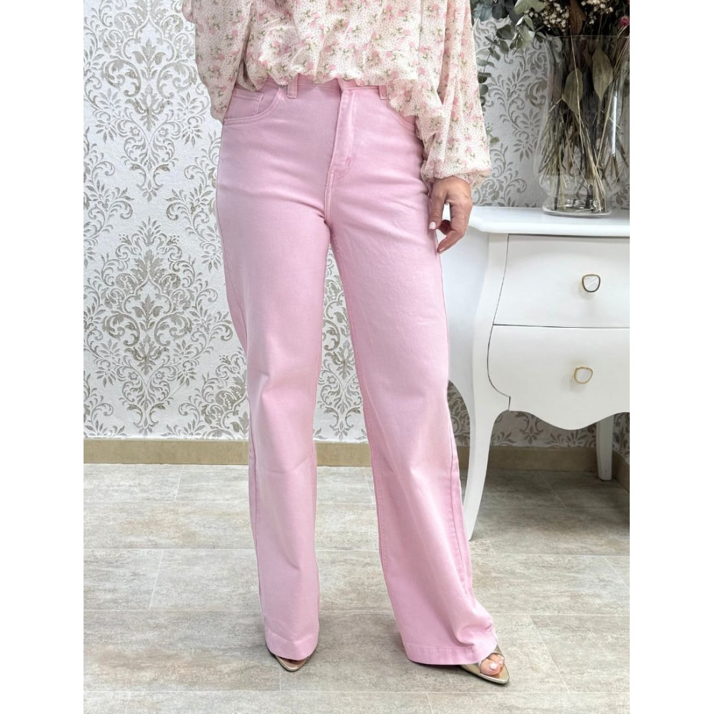 Pantalón vaquero de corte recto y tiro alto confeccionado en denim de color rosa pastel. Presenta una estructura clásica de cinco bolsillos.