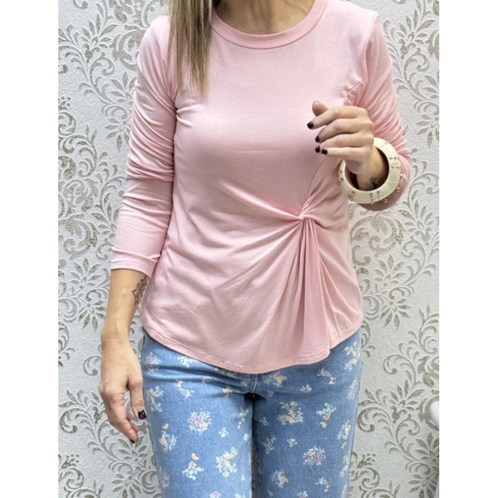 Camiseta confeccionada en tejido de punto elástico con acabado suave. Presenta un diseño de manga larga, cuello redondo clásico y destaca por un detalle de nudo lateral fruncido en la cintura que crea pliegues asimétricos en el frontal. El bajo es redondeado y el patrón es entallado, adaptándose a la silueta.