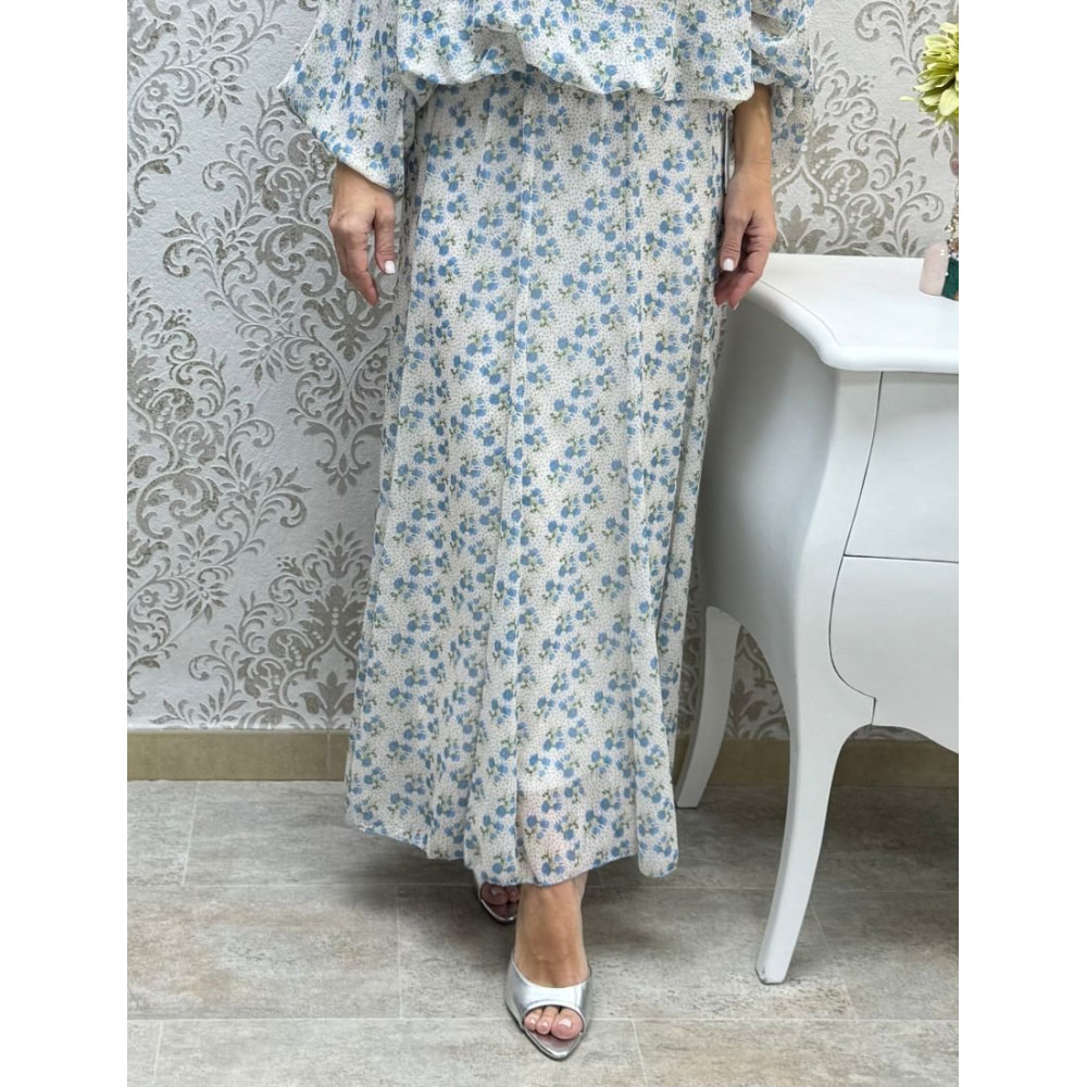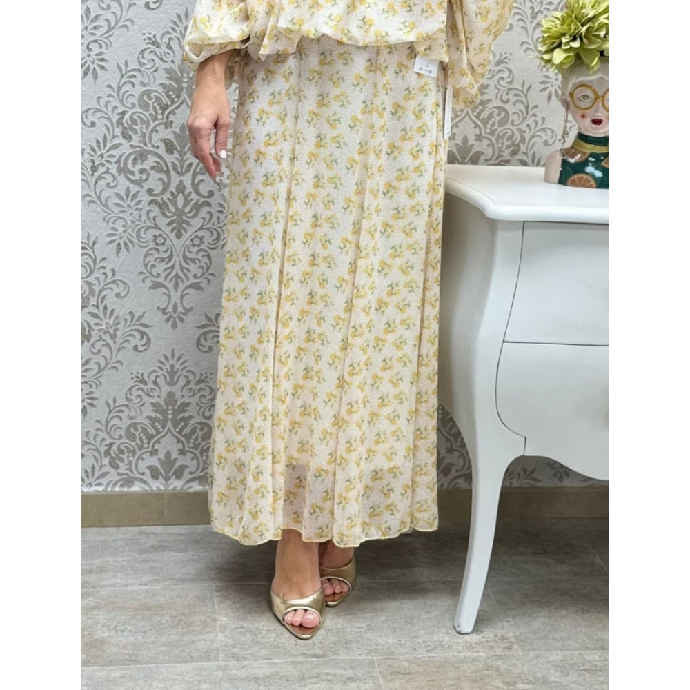 Falda de largo maxi con estampado floral micro sobre fondo moteado. Diseñada con paneles verticales cosidos de arriba abajo. Estas costuras recorren toda la prenda, dándole una caída con vuelo y movimiento en la parte inferior.