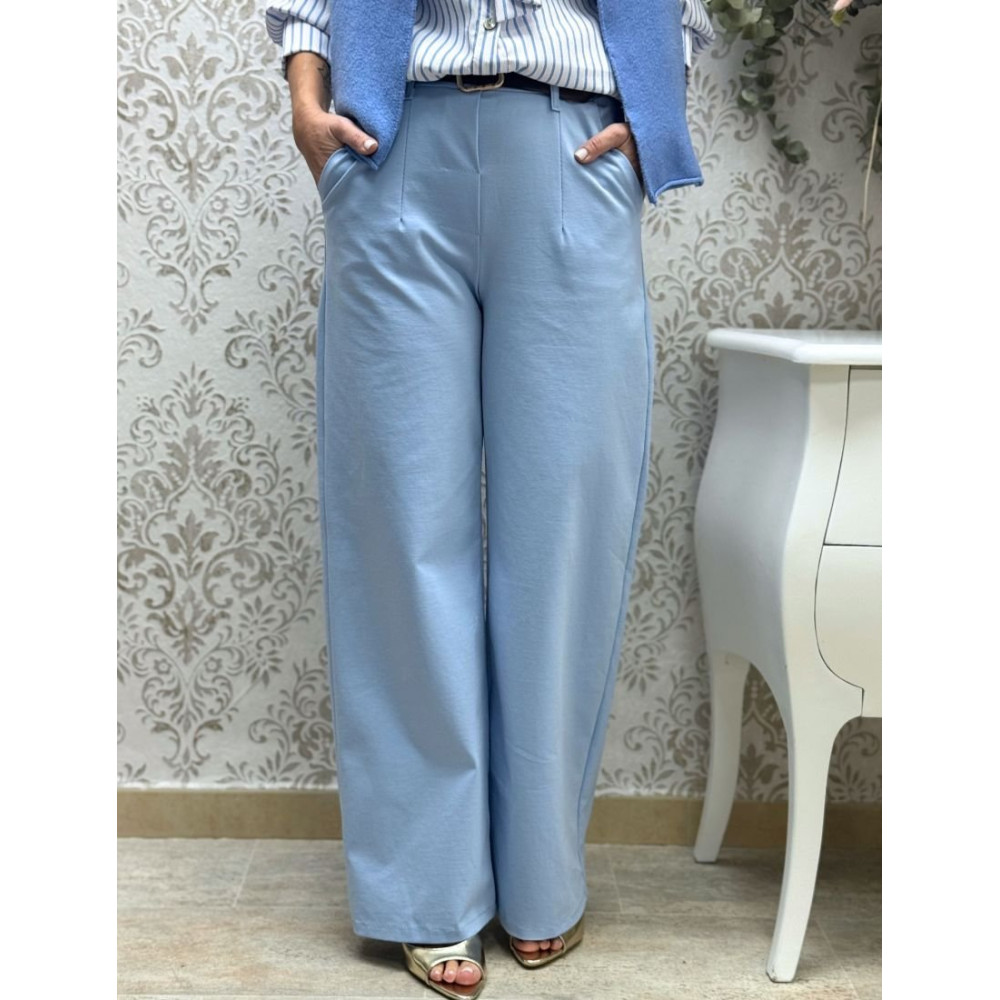 Pantalón de tiro alto y silueta de pierna ancha con acabado liso en color azul celeste. El diseño integra una cintura elástica con trabillas y detalles de pinzas frontales que aportan estructura a la caída de la prenda. Cuenta con bolsillos laterales de costura discreta.