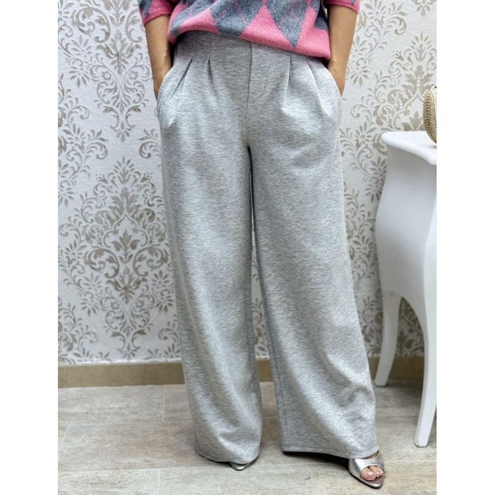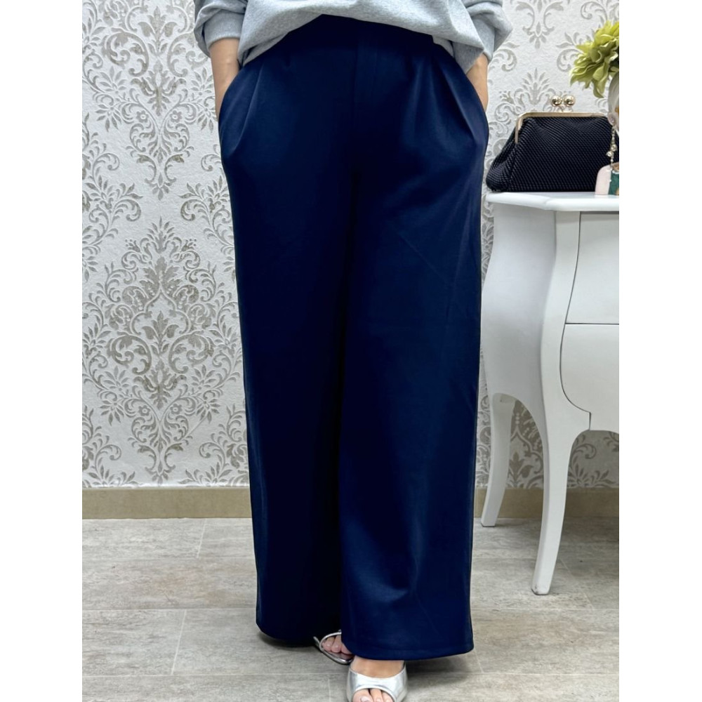 Pantalón de corte wide leg y silueta fluida. Presenta un diseño de tiro alto con cinturilla lisa y detalle de pinzas frontales que aportan volumen y caída a la pierna ancha. Cuenta con cintura elástica en la trasera