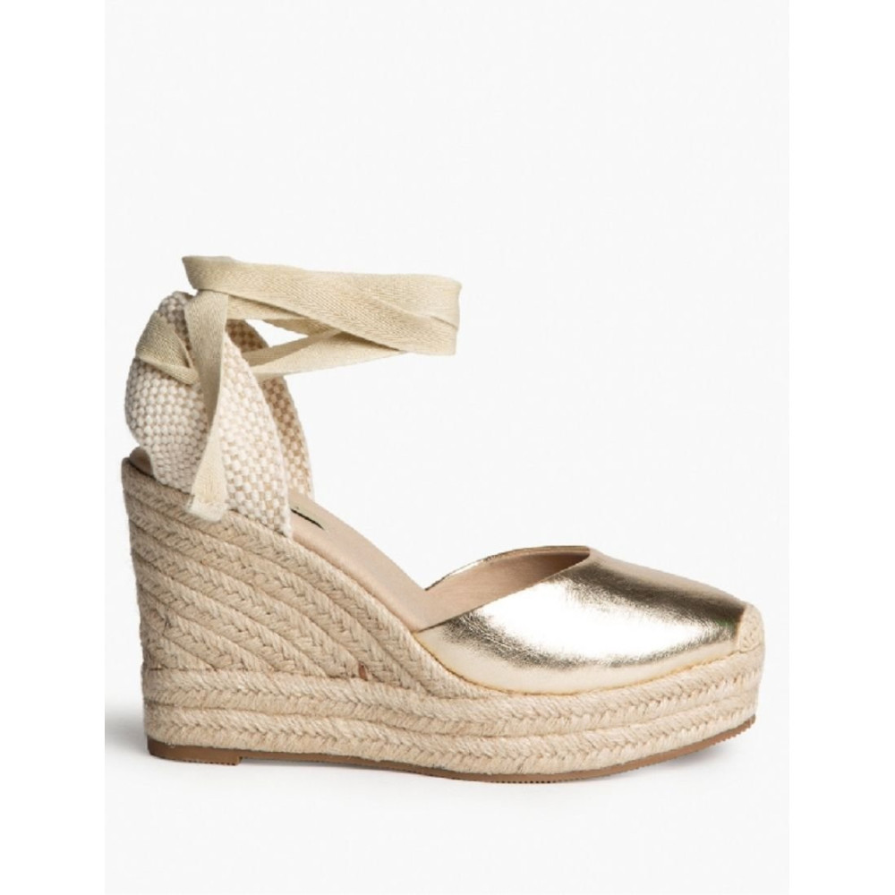 Plataforma tipo valenciana, con cuña en esparto. Escote redondo y cierre mediante tiras anudadas al tobillo.