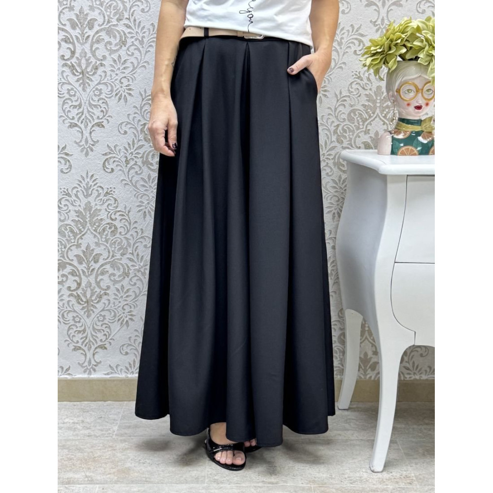 Pantalón de corte palazzo con silueta extra amplia. Presenta un diseño de tiro alto con cinturilla de trabillas y detalle de pinzas profundas en el frontal que acentúan el volumen y la caída de la pierna. Cuenta con bolsillos laterales de costura invisibles y un bajo de gran amplitud con acabado limpio.