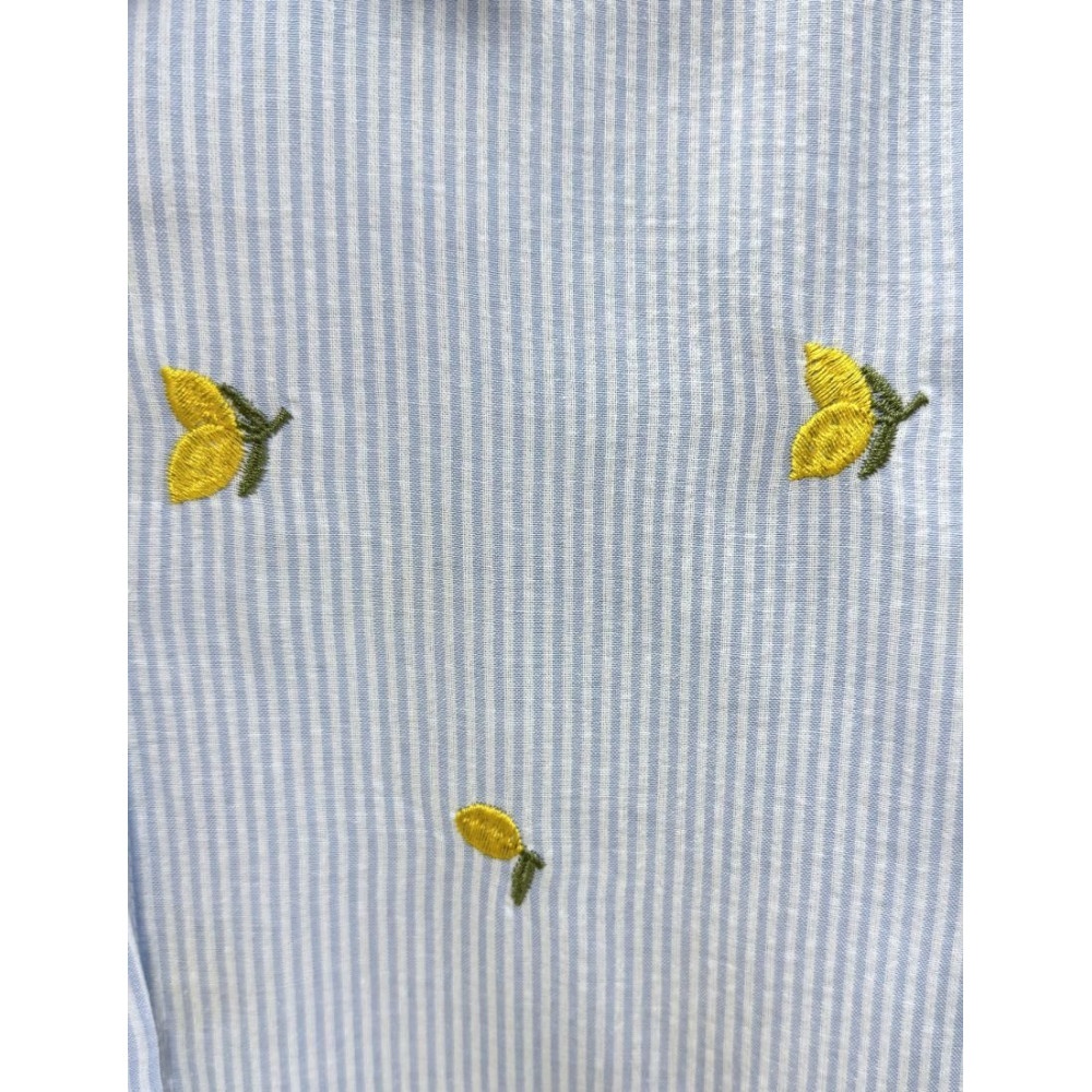 Camisa de corte recto con estampado de rayas verticales finas en color azul claro y blanco. Presenta un diseño con cuello camisero clásico, cierre frontal de botonadura completa en color blanco y manga larga con puños sencillos. Destaca por un patrón de limones bordados en color amarillo distribuidos por toda la prenda.