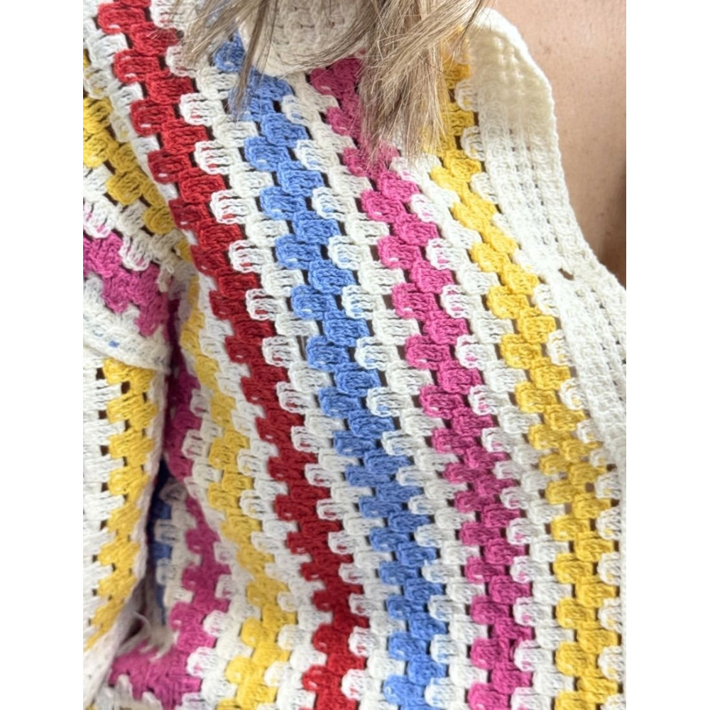 Camisa de manga corta confeccionada en punto de crochet con un diseño de rayas verticales multicolores en tonos rosa, amarillo, azul y rojo sobre base cruda. Presenta un cuello camisero de solapa clásica y cierre frontal completo mediante botones de efecto carey. El patrón es de corte recto con hombros ligeramente caídos y cuenta con acabados acanalados en el bajo y los puños de las mangas, manteniendo una estructura calada y artesanal en todo el tejido.