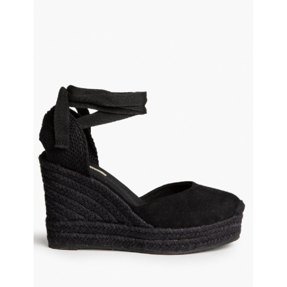 Plataforma tipo valenciana, con cuña en esparto. Escote redondo y cierre mediante tiras anudadas al tobillo.