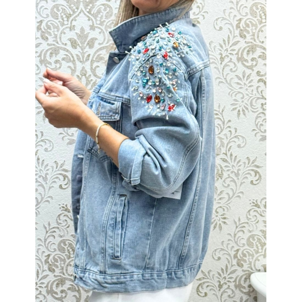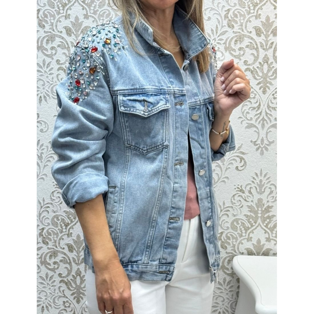 Chaqueta vaquera de lavado claro con corte recto y cuello camisero. Presenta cierre frontal de botones metálicos, dos bolsillos de parche con solapa en el pecho y dos bolsillos laterales integrados en la costura. El hombro y la parte superior de la manga están adornados con una densa aplicación de pedrería y cristales facetados de varios colores, como rojo, azul, verde y blanco.
